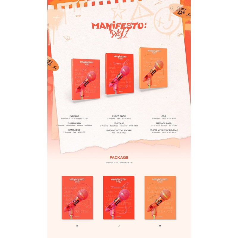 ■ CD + Photobook (D v: 92p / J v: 76p / M ver: 80p + 2 Photocards (Random 2 out of 14) + Postcard (1 out of 7) + Message Card (Random 1 out of 7) + Can Badge + Instant Tattoo Sticker + Poster with Lyrics (on Pack)