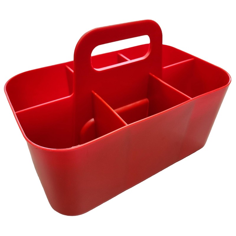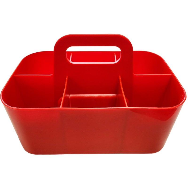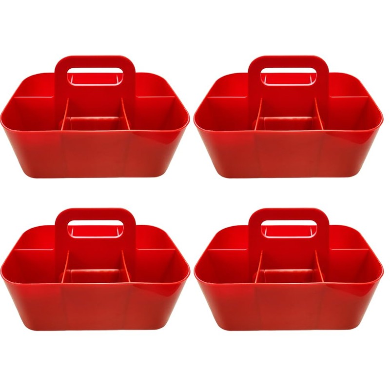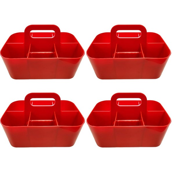 Enjoy Organizer - Small Stackable Plastic Caddy with Handle 6 Compartment | Desk, Makeup, Dorm Caddy, Classroom Art Organizers - 4 Pack, Made In USA (Red)