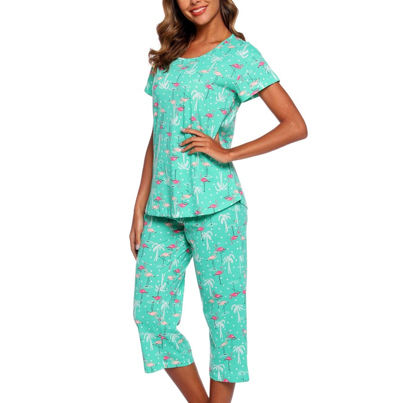 ENJOYNIGHT Women's Cotton Pajamas Set Short Sleeve Top with Capri Pants Sleepwear Set (Medium, G.Flamingo)