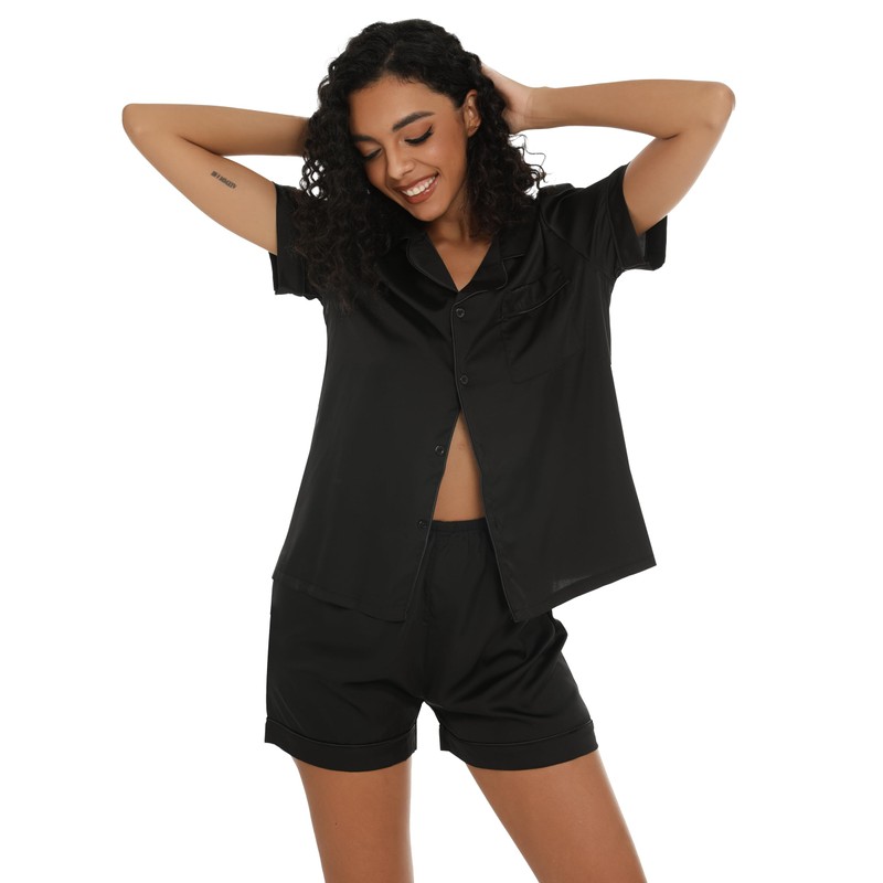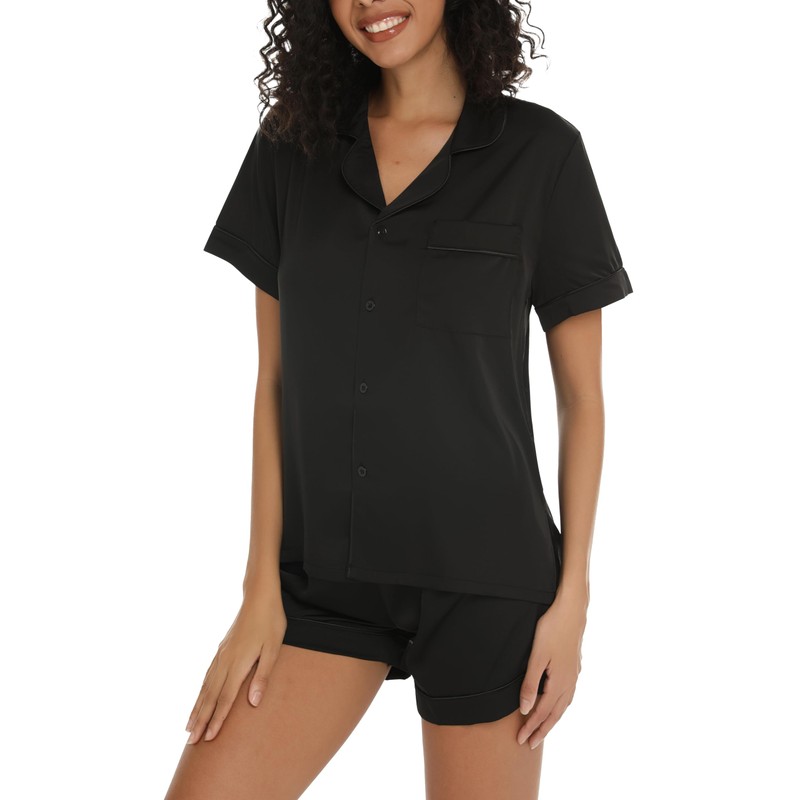 ENJOYNIGHT Women's Silk Satin Pajama Set Short Sleeve Pj Button Down Sleepwear Loungewear Button Down Loungewear(X-Large,Black)