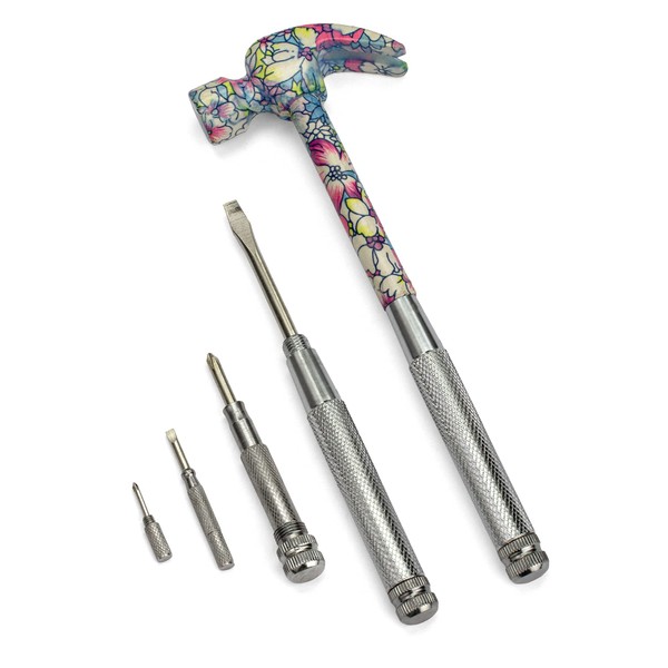 - 💜 Includes: floral pattern hammer head with claw, #00 Phillips, #1 Phillips, big 3/16” slotted bit, and small 3/16” slotted bit. 8 oz. claw hammer, measures 8” in length.