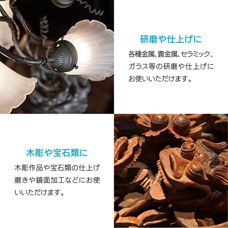 - Can be used for polishing various types of metals, precious metals, ceramics, glass, and wood carving, jewelry, and mirror processing