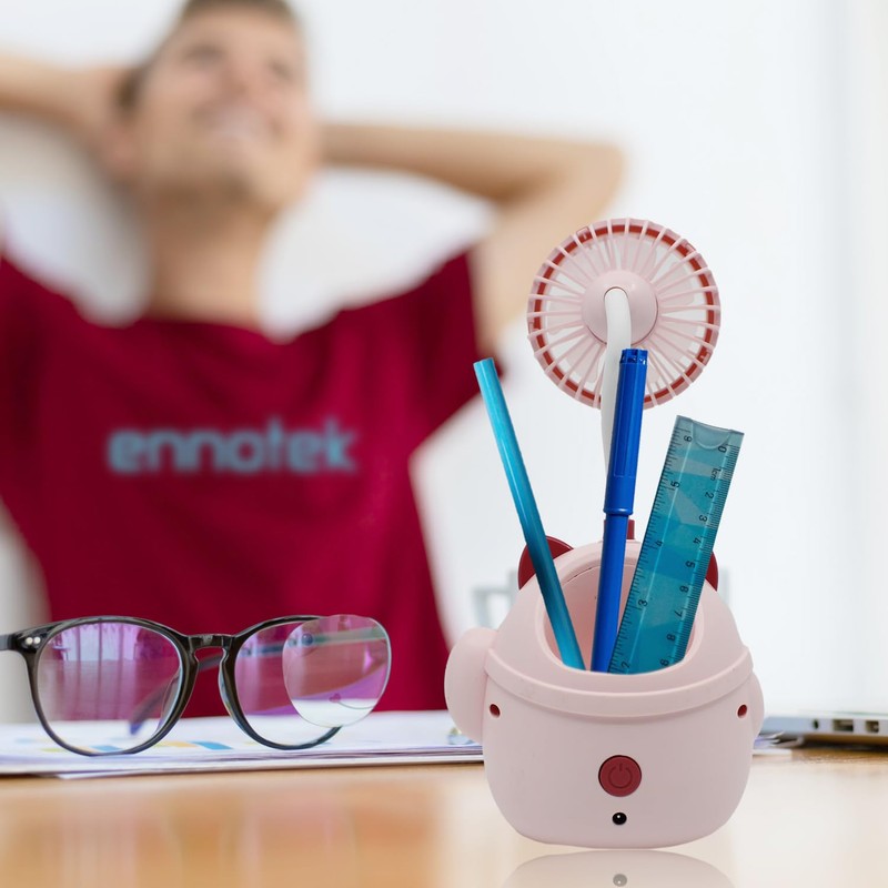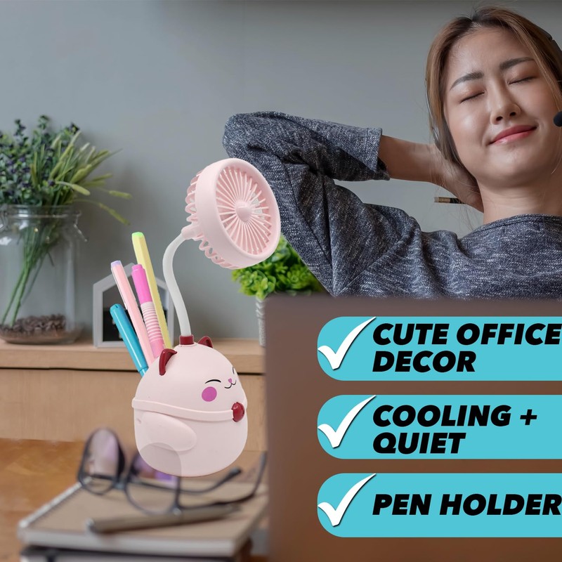 - Small USB Fan for Decor: This cute animal portable desk fan has an opening in the back to store pens and pencils. This makes these cute fan friends ideal fun desk accessories for work, school, or home!