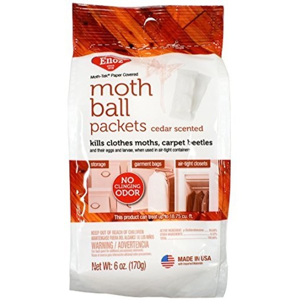 - ENOZ MOTH BALL PACKETS: These cedar scented moth ball packets kill clothes moths & carpet beetles & their eggs & larvae. Each packet is individually wrapped & ideal for flat storage areas, like drawers, blanket chests, sweater boxes & closet shelves.