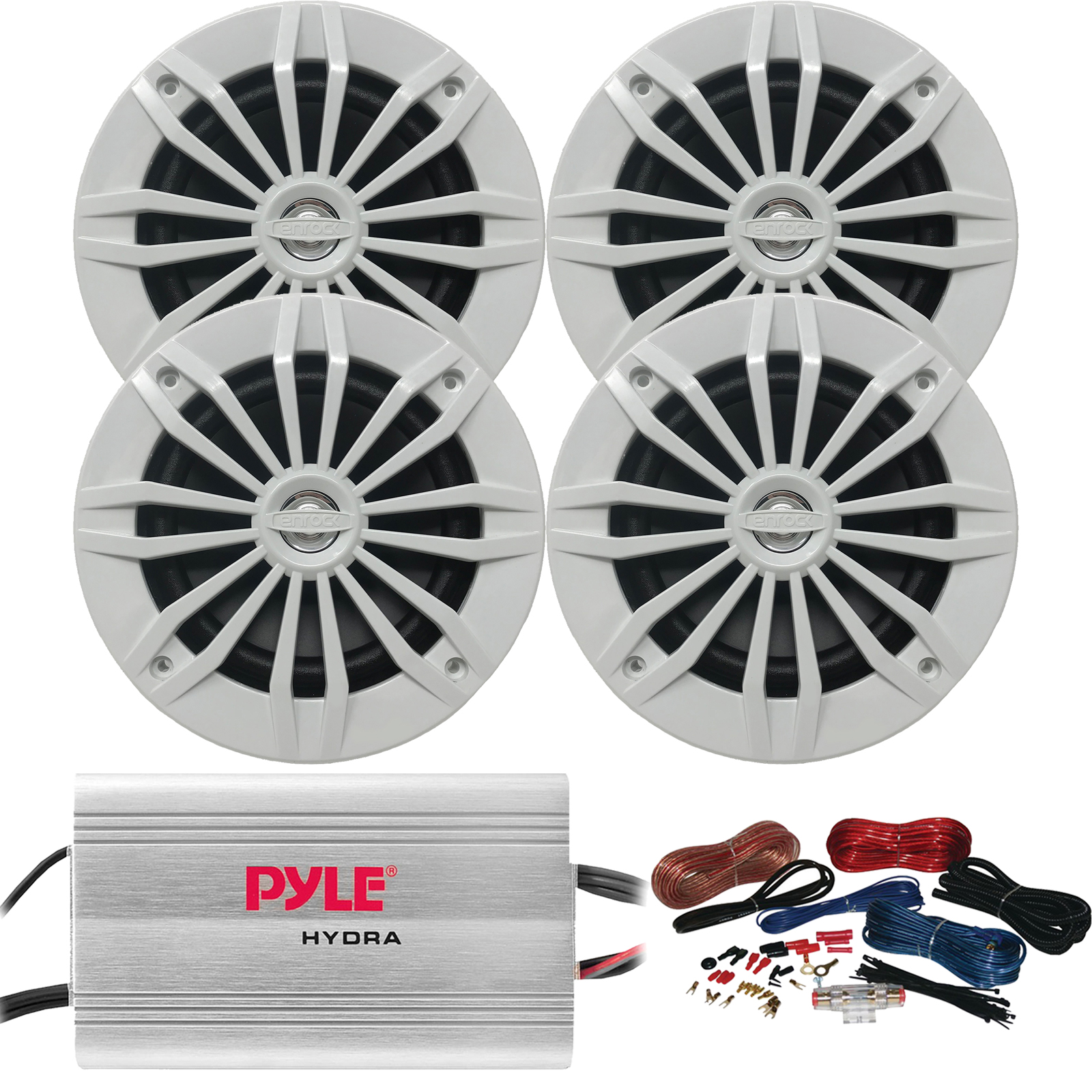 4 x Enrock 6.5" 2-Way 180W White Marine Speakers, Pyle 4-Channel 400W MP3/iPod 2-Ohm Stereo Stable Amplifier, Marine-Grade 8-Gauge Amp Installation Kit