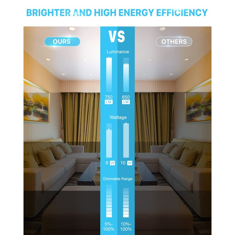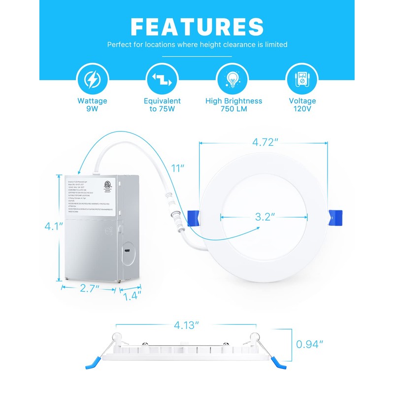 - 💡【High Brightness】The 4-inch slim lights use the new generation of LED chips with higher lumens and lower power. 750LM consumes 9 Watts, which equals to 75W incandescent lamp, saving you up to 88% in energy costs. Frosted LED lens for anti-glare and scratch-resistant.