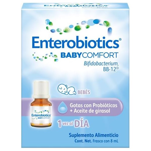 Product Description: Enterobiotics Baby Comfort Drops offer a gentle and effective solution for supporting your baby’s digestive health. Infused with probiotics and sunflower oil, this formula is designed to promote a healthy gut microbiome, reduce discomfort, and support overall digestive function. The carefully balanced blend of probiotics helps relieve bloating and colic, making it easier for your little one to feel comfortable. With an 8ml bottle, Enterobiotics Baby Comfort provides a convenient and easy-to-administer solution for your baby's wellness. Trust this soothing and natural remedy to support your baby’s tummy troubles and promote a healthy digestive system.