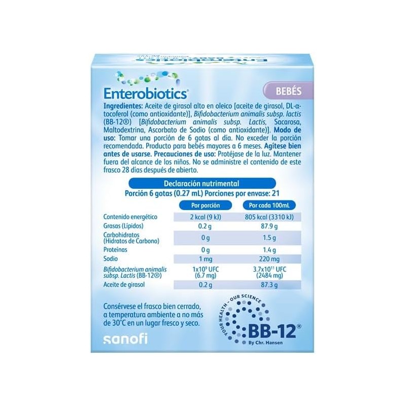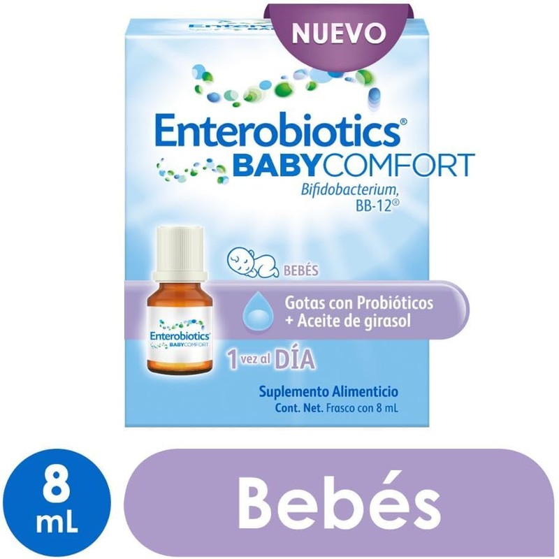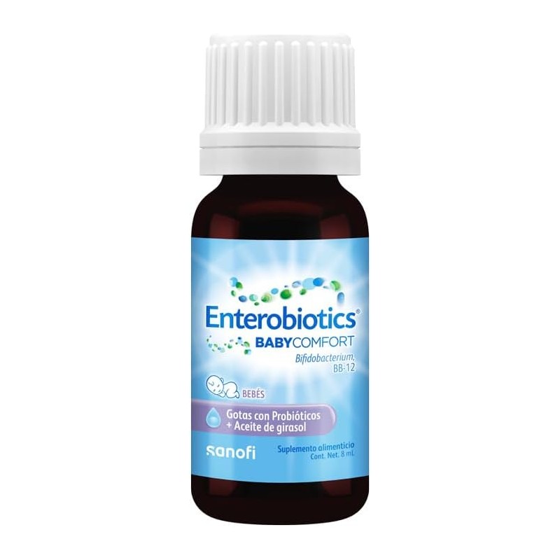 Enterobiotics Baby Comfort es un suplemento en gotas que combina probióticos y aceite de girasol, formulado especialmente para apoyar la salud digestiva y fortalecer el sistema inmunológico de los más pequeños. Su fórmula ayuda a equilibrar la flora intestinal, reducir los cólicos y mejorar la absorción de nutrientes. Gracias a su presentación en gotas, es fácil de administrar y de rápida absorción.