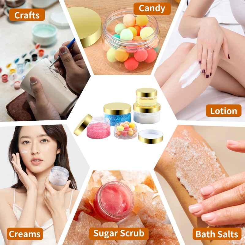 - [MULTIPURPOSE]:This clear plastic round storage jar can not only be used for storing creams, lotions, bath salts, sugar scrubs, fondants, lip scrubs, cosmetics and other items, but it is also suitable for storing dry food, nuts, spices, flour, cute candies, or other handmade products, all of them are a very good choice, but it is not recommended to place the objects of higher temperature, you can wait for them to be cooled before storing them.