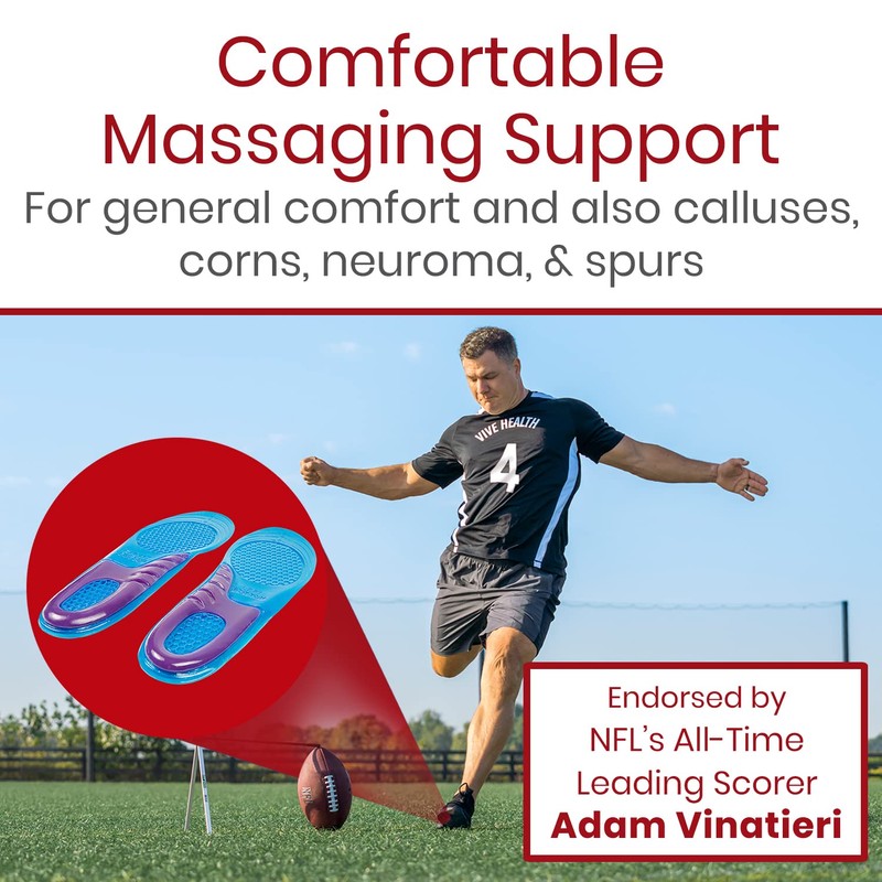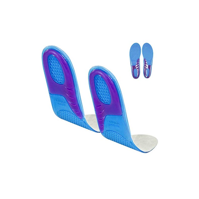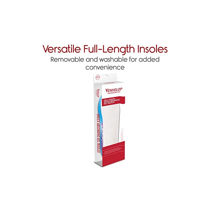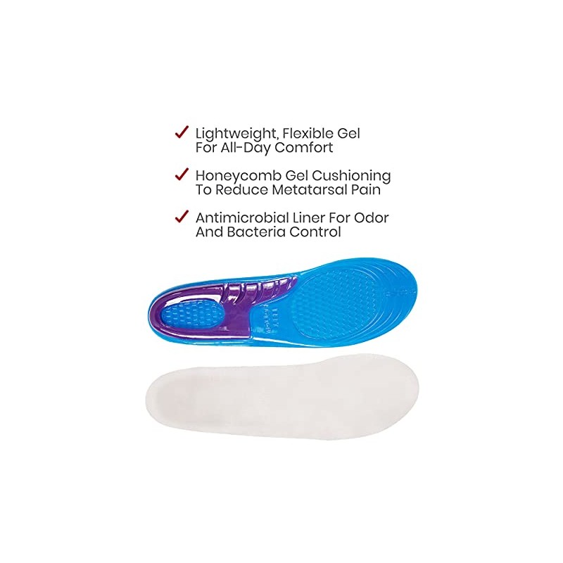 - VERSATILE FIT FULL-LENGTH INSOLE: Easily worn with most shoe styles, the versatile gel inserts can be trimmed for a customized fit. The full-length insoles have a textured base to grip the inside of your shoe, eliminating slipping for greater stability and comfort. Also relieving pain and pressure caused by spurs, corns, and neuroma, the massaging gel insoles are perfect for individuals who are on their feet all day.