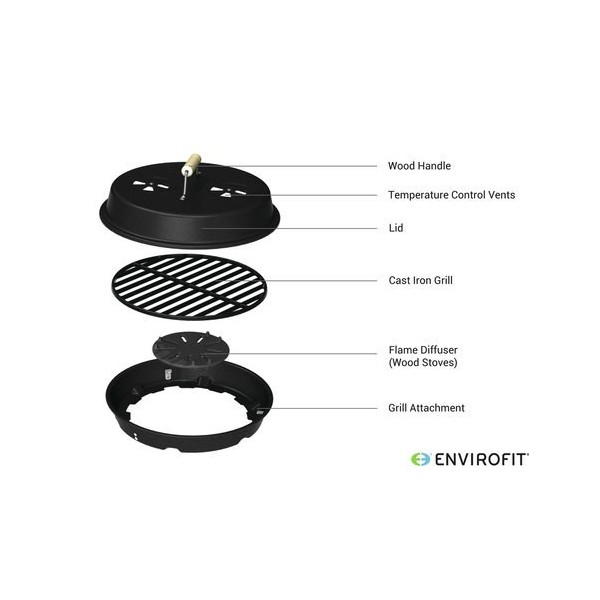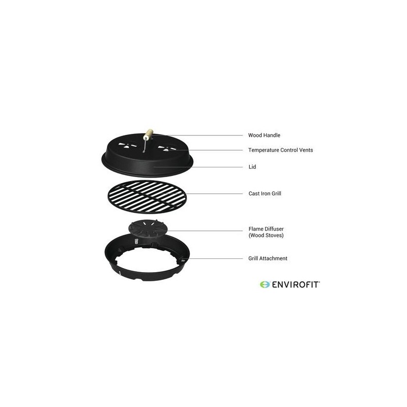 - Cast Iron Flame diffuser cooks evenly over wood (not needed for charcoal)