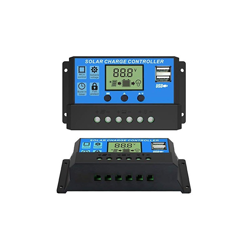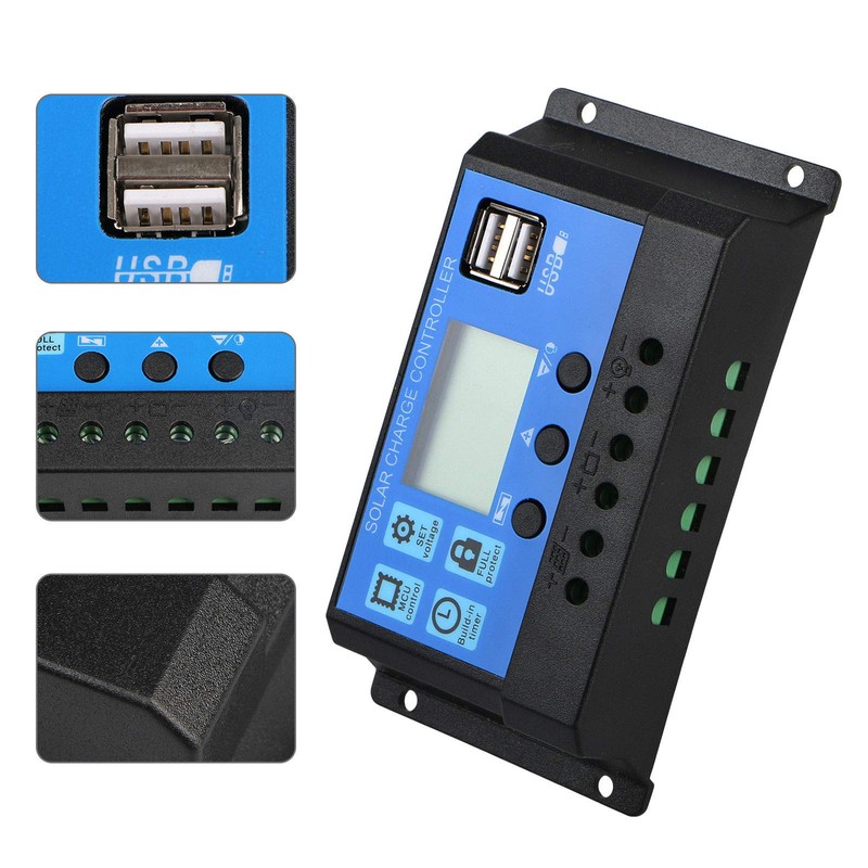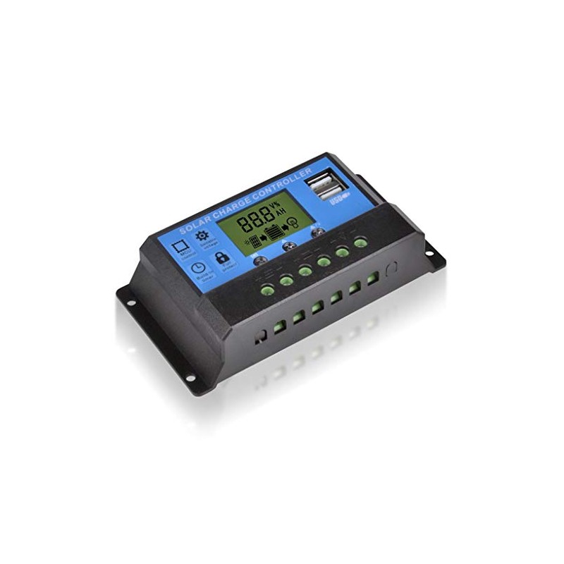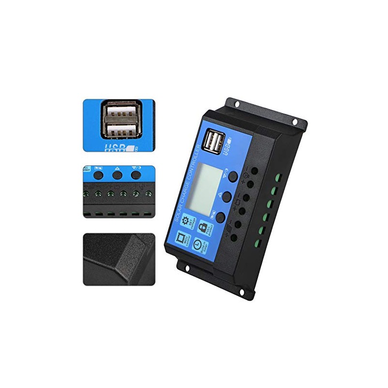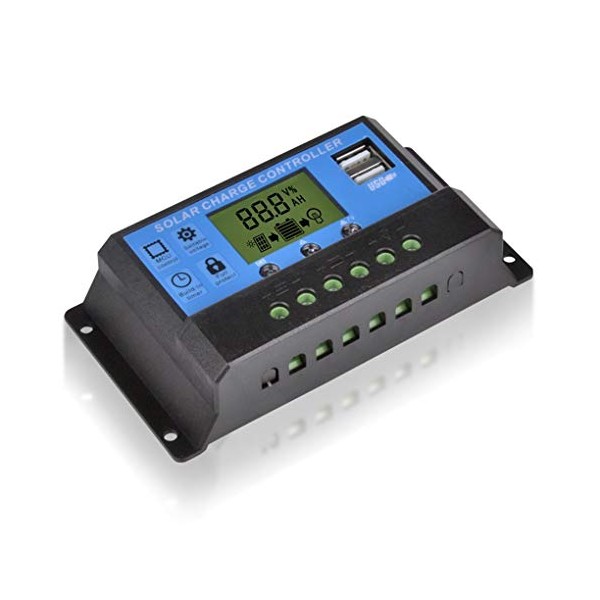 This 10A 12/24V Solar Battery Charge Controller automatically manages and regulates the voltage and current to the battery from the solar panel(s). It incorporates short-circuit, open-circuit, reverse polarity, and overload protection in order to ensure that the batteries are not overcharged and that power isn't discharged from the batteries to the solar panels during shaded or dark conditions and drain the batteries. It comes with USB ports to charge for your phone and other electronic devices directly from the controller.
