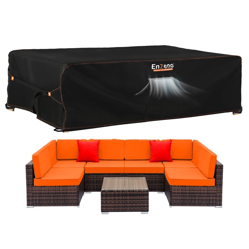 - Enzeno Patio Furniture Set Covers-- Is your expensive furniture damaged by rain, sun exposure, dust ? The new Outdoor table covers has been tested to withstand 10,000pa of water pressure and can stay dry for 1800 hours when water is accumulated. The interior is coated with an environmentally friendly silver-coated coating that absorbs UV and other visible light to prevent furniture aging.