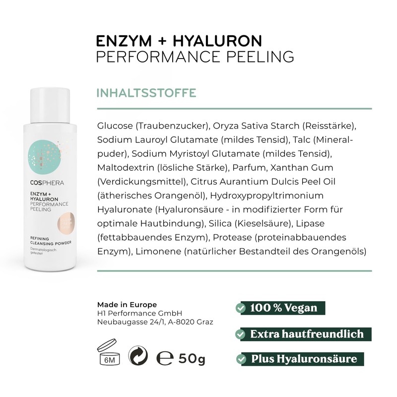 - ✅ YOUR SATISFACTION IS IMPORTANT TO US: We want our products to meet your expectations and you are completely satisfied. If this is not the case, we will find a satisfactory solution for you - without ifs and buts. Order the hyaluronic enzyme scrub now from Cosphera.