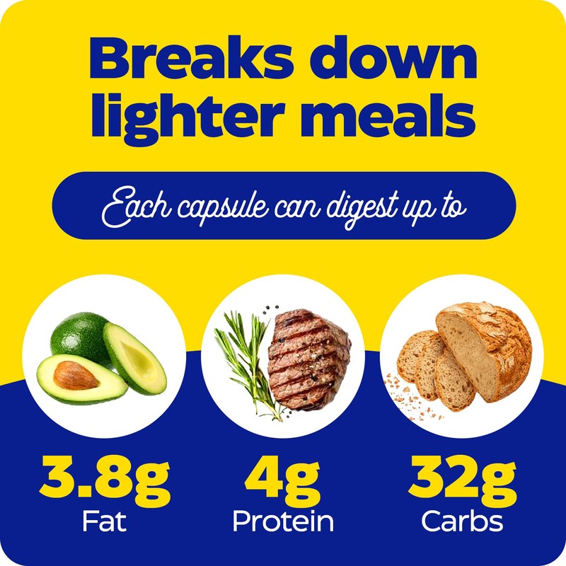 • SMALL CAPSULE, BIG SUPPORT: One easy-to-swallow small capsule with every meal provides enzymes to digest proteins, carbohydrates, dairy, fats, and fibers – even for larger meals!
