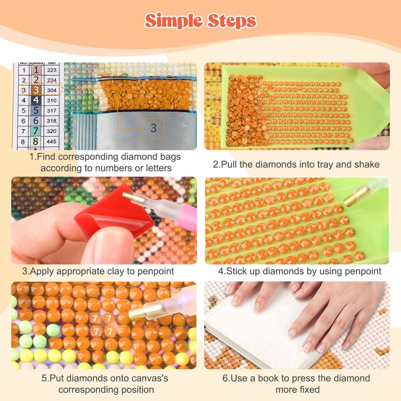 Diamond Art Painting Kits: Diamond art painting kits include enough diamond beads, 1x waterproof clear painting canvas, 1x tray, and 1x bigger diamond art painting wax, 2x different diamond art painting pens, 1x corrector to make diamonds neatly arranged, 5x small diamond art storage bags.