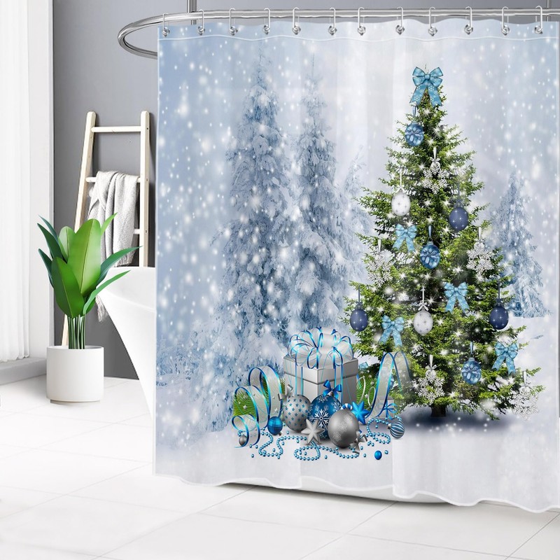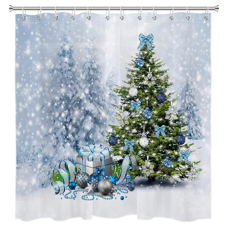 EOBTAIN Christmas Pine Tree Shower Curtain Blue Silvery Xmas Balls Gifts Bow Winter Forest Snow Scene White Snowflake Bathroom Curtain for Kids with 12 Hooks 69X70Inches Fabric Durable