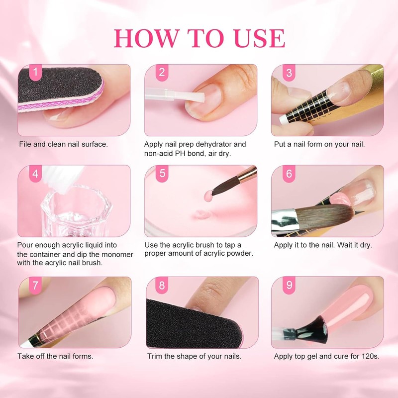 - No curing required and easy to use: the acrylic nail system does not require a nail lamp to cure and this clear acrylic nail powder only takes a few steps with acrylic liquid to design nails. It is useful for beginners to practice and DIY fashionable nails.