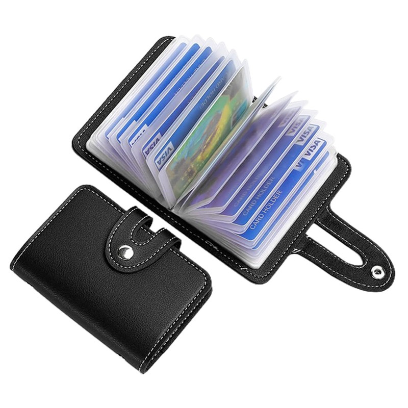 - Made from soft, durable PU leather, this card holder can hold up to 24 cards as well as compartments for notes, coins and documents.