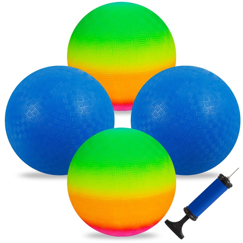 - WHAT IS INCLUDED: Set of 4 playground balls (2 rainbow colors, 2 blue) and 1 pump. The colourful bouncing balls are easy to inflate and reach a diameter of up to 22 cm