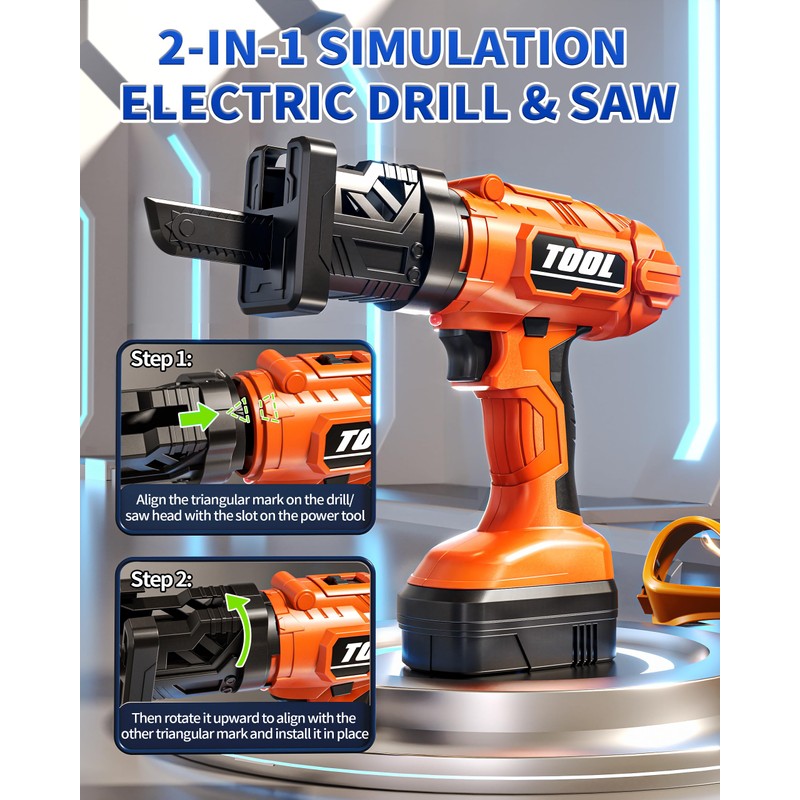- 【2 in 1 Electric Drill & Electric Saw】With 2 replacement heads, the electric drill can be turned into an electric saw. Only 2 AA batteries are needed to simulate sounds and actions, allowing children to repair their own toys like dad.
