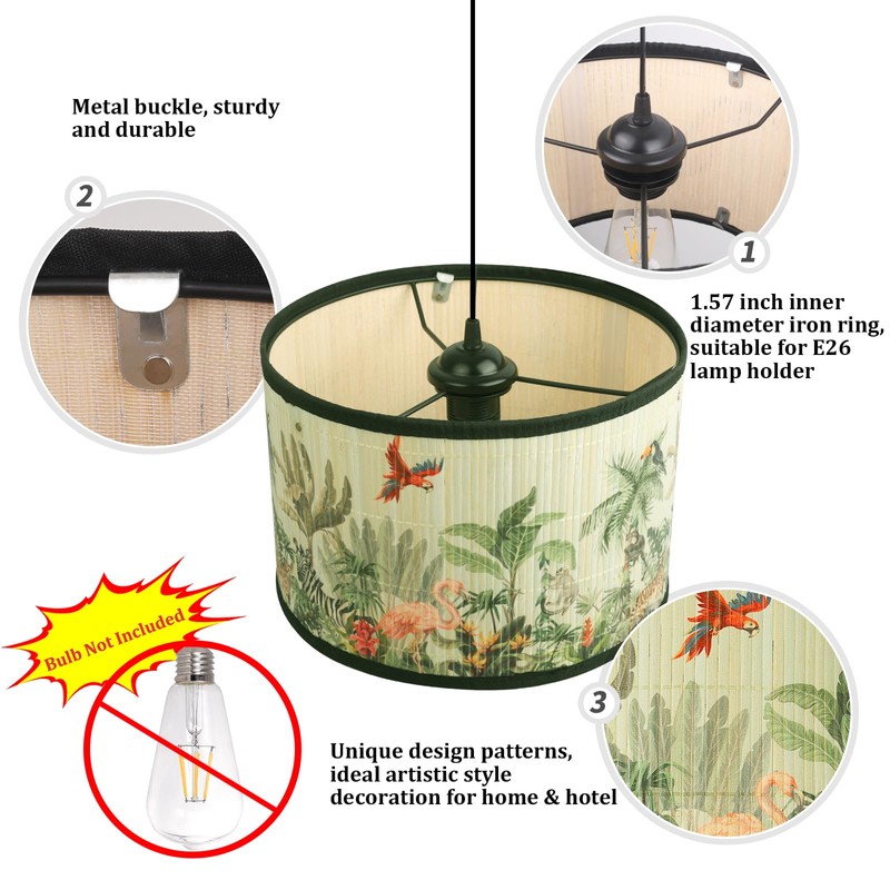 - 【Product Information】Bamboo Lampshade Size: 11.81"Dia.x7.87"H(30cmx20cm);Pendant Light Plug in Cord Length:14.76ft(4.5m);Voltage: 110-120V. Bulb is NOT included. Eoiips hanging lights with plug in cord adopts E26 USA Standard Lamp Base, UL Listed, compatible with any E26 base,such as incandescent bulb, LED bulb, etc.,Max 60W. There are many pattern styles available as your preferences. There is a Installation Video in the Product Description.