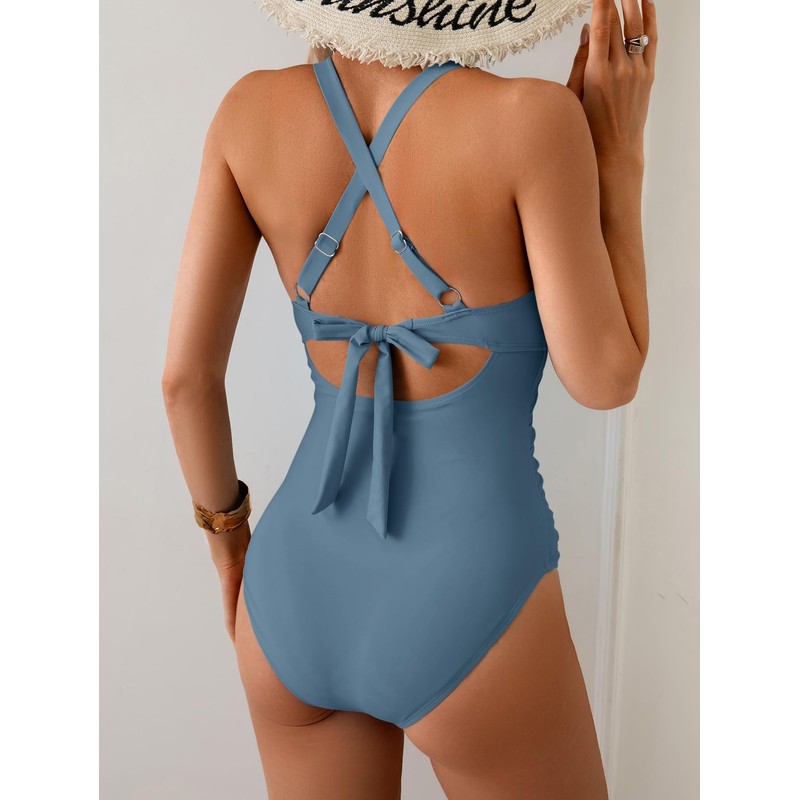 Eomenie One Piece Swimsuit for Women Tummy Control Cutout Bathing Suit V Neck Tie Back Swim Suit Grey Blue