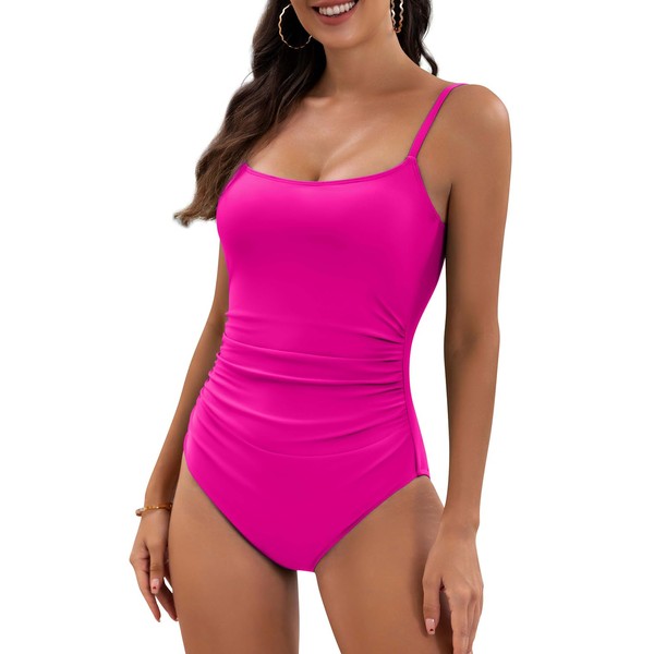 Eomenie Women's One Piece Swimsuits Tummy Control Ruched Bathing Suit 1 Piece Swimwear Hot Pink