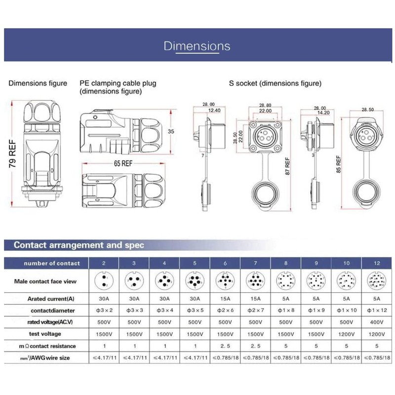 - Rated current: 30A, working voltage: 500V AC, Diameter range: Φ 3*3, Waterproof Protection level: IP67.