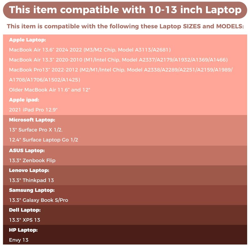 - Compatible with 10-13.6 inch laptop – suitable for MacBook Air 13.6 inch 2024 2022 (M3/M2 chip, A3113/A2681). MacBook Air 13.3 inch 2020-2010 (M1/Intel Chip, A2337/A2179/A1932/A1369/A1466). MacBook Pro 13 2022-2012 (M2/M1/Intel Chip, A2338/A2289/A2251/A2159/A1989/A1708/A1706/A1502/A1425) MacBook Air 11.6/12" 2021 iPad Pro 12.9 inches. 13 inch Surface Pro X 1/2. 12.4 inch Surface Laptop Go 1/2. 13.3 inch ASUS Zenbook Flip. 13.3 inch Lenovo Thinkpad 13. 13.3 inch Samsung Galaxy Book S/Pro. 13.3 inch Dell XPS 13. HP Envy 13