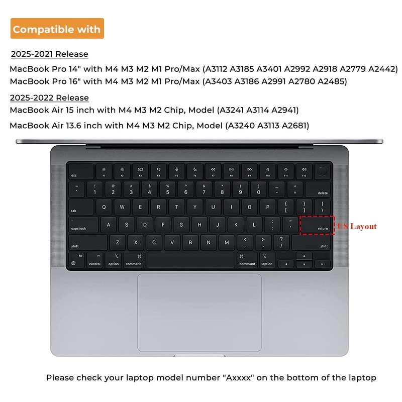 - ✔️Fit precisely for 2024 2023 MacBook Air 15 inch M2 chip (model: A2941), 2022 2023 MacBook Air 13.6 inch M2 Chip (model: A2681) & compatible for MacBook Pro 14 inch M3 M2 M1 Pro/Max chip 2023 2022 2021 release (model: A2918 / A2992 / A2779 / A2442) & compatible with MacBook Pro 16 inch M2 M1 Pro/Max chip 2023 2022 2021 release (model: A2991 / A2780 / A2485). US Keyboard Layout Only. Please check your MacBook's model number "Axxxx" on the bottom of the laptop. Not Compatible for MacBook Pro 13 inch.