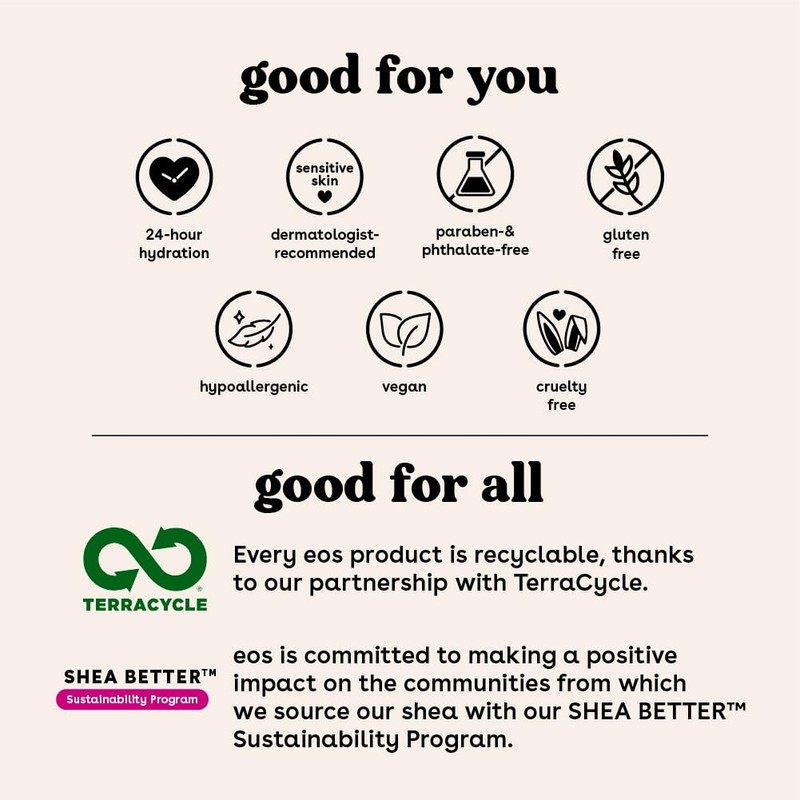 eos Vanilla Cashmere Whipped Oil Butter delivers intense moisture and long-lasting protection with a luxuriously thick, buttery texture. Perfect for skin that needs a little extra, dry climates, or as a nighttime treatment, this rich formula melts into skin, creating a smooth, velvety finish that locks in moisture for 72 hours. Infused with our Cashmere Smooth Complex™ of shea, cocoa, and argan butters, plus coconut oil, it softens and strengthens the skin barrier. Experience a truly indulgent self-care moment with this deeply hydrating, non-greasy butter that leaves your skin feeling soft, protected, and nourished without the heaviness or stickiness of other moisturizers.