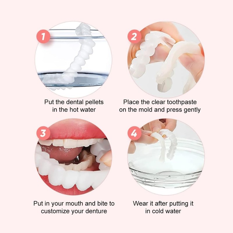 - Beautiful dentures with veneers: Place in hot water (boiling) before use, can be adapted to most people. You can heat and reshape it as often as you like until you are satisfied.