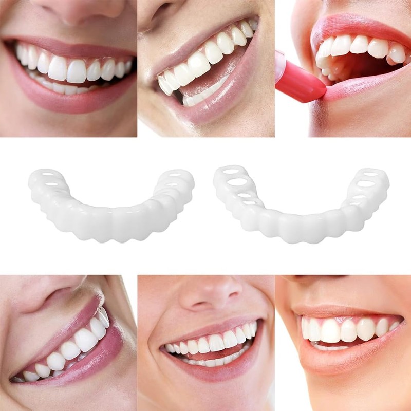 - Instant veneer dentures: The perfect imprint of the inner surface of your teeth is the key to keeping your teeth last all day long, not glue. So practical that your curious tongue won't even realize it's there. What you get: 2 pairs upper and lower jaw dentures + 4 pieces tooth strips. You will also receive 2 boxes to pack the product.