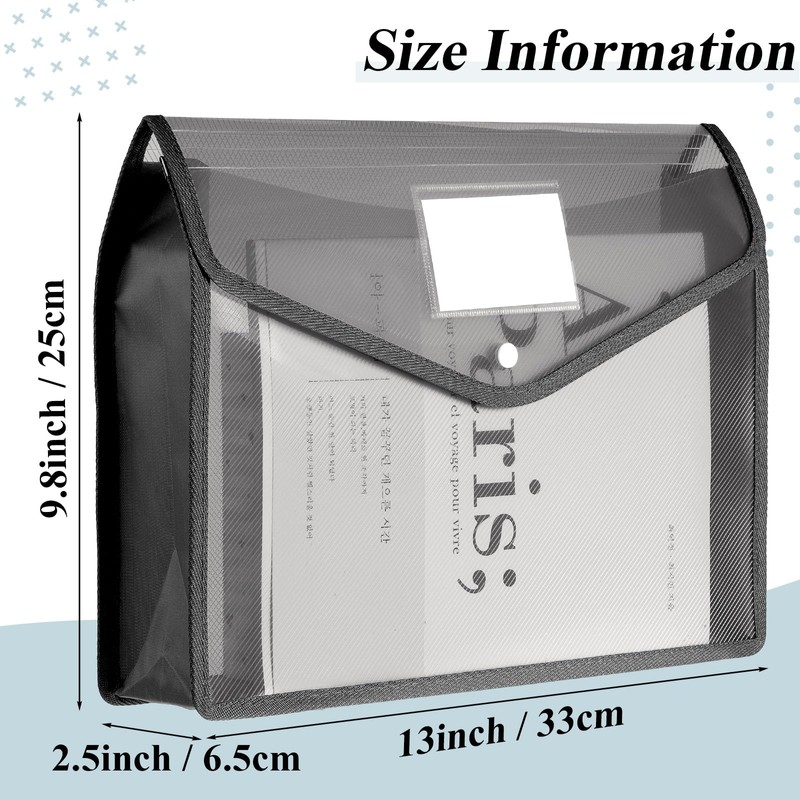 - Enough capacity storage: the A4 envelope expanding file measures 13 x 9.8 x 2.5 inches/ 33 x 25 x 6.5 cm, suitable for storing notebooks, stationery, magazine, paperwork, contract, important documents, certificates, business cards, tax receipts, even tablets, cosmetic and more