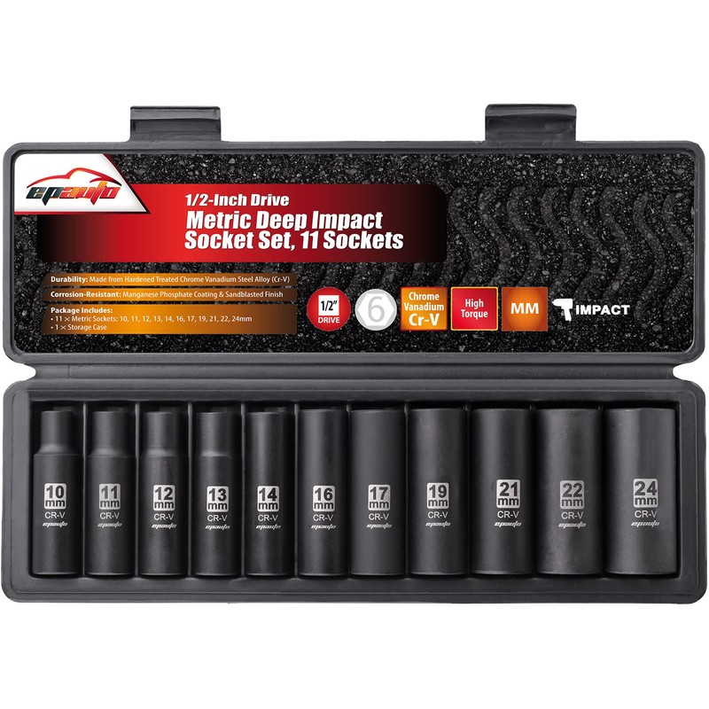 EPAuto 1/2-Inch Drive Metric Deep Impact Socket Set, Cr-V, 6 Points, 11 Sockets