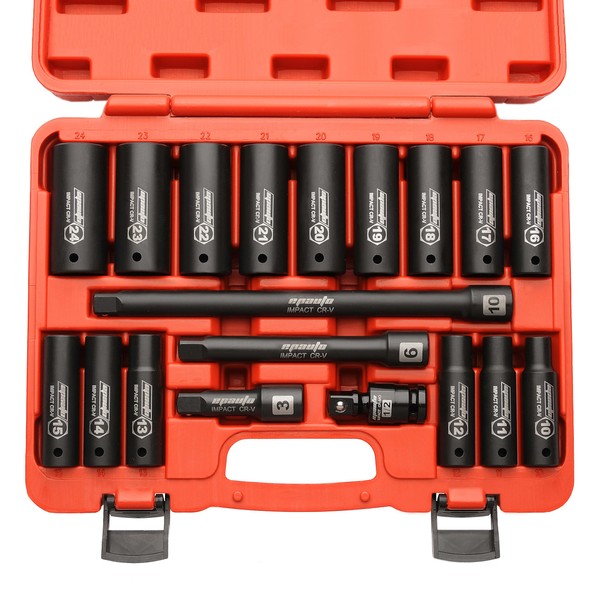 EPAuto 1/2-Inch Drive Metric (10-24 mm) Deep Impact Socket Set | Extension Bar | Universal Joint, Cr-V, 6 Points, 19 Pieces