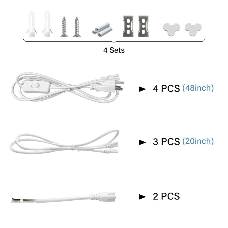 • Packing List: 4pcs Barrina T5 4ft led shop light,4pcs Power cords with ON/OFF switch, 3pcs Hardwire, 4pcs 20inches Connector cables, 4pcs Small connectors, 4pcs Installation accessories. Cannot be compatible with motion sensors, otherwise it will shorten the lifespan