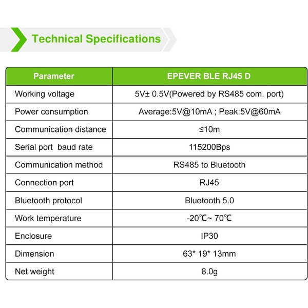 - EPEVER-BLE-RJ45-D enables data collection,communication,and wireless monitoring of connected devices.