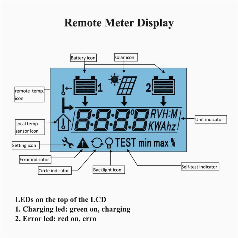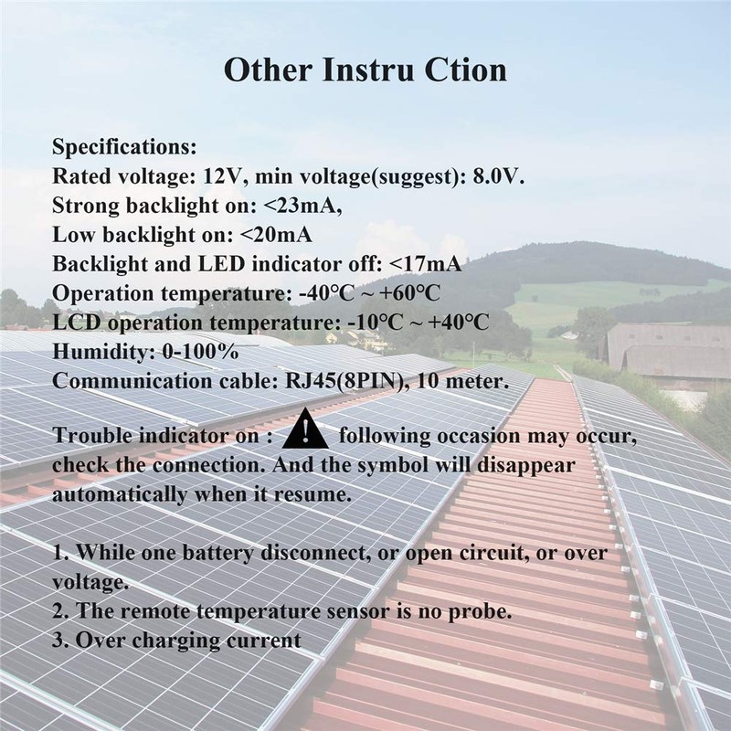 - ★LCD display with two levels of brightness ,Monitor voltage, currents, amp-hour, and w-hour ,LED lights to indicate charges and errors.