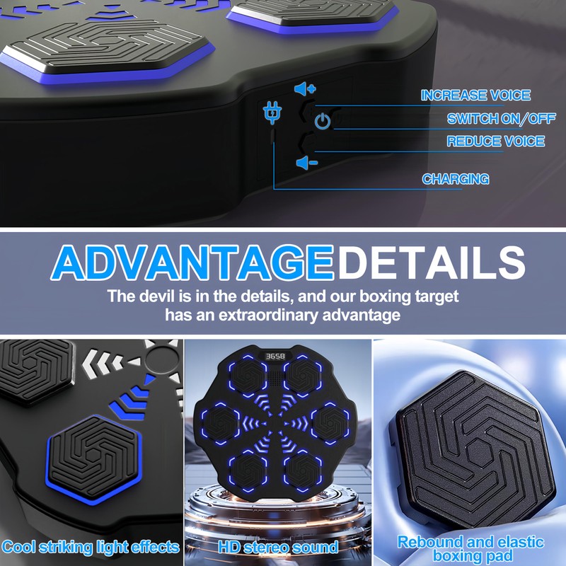 • 🎶【Value for money?YES!】This boxing equipment is made with advanced pressure sensors, EVA cushioning, rugged PC panels and ABS alloy. Offering unparalleled resilience and shock absorption, ensuring durability and protecting your hands. The LED smart display shows your effective hits, calorie count, and recording time, allowing you to stay motivated and focused during your workout. Upon hitting the target, the device emits dazzling light effects, elevating your workout with cool LED visuals.