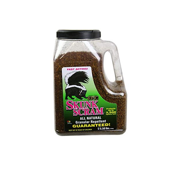 Epic Skunk Scram is an ideal repellent to keep skunks from your property and buildings. All natural formula is safe to use around children and pets. Also approved for organic gardening. It contains higher active ingredients and easy to apply granular formula specifically repels skunks.