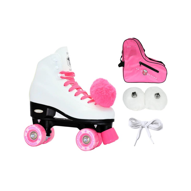 - Bundle Includes: Skates, PomPoms, Skate Bag, Toe Plugs, & 2 Pair Laces (White & Pink)