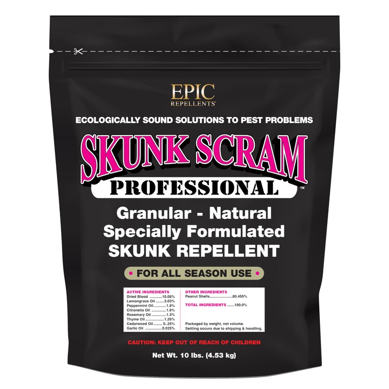 - EPIC SKUNK SCRAM PROFESSIONAL -- America’s Finest granular skunk repellent -- is specifically designed to stop and prevent damage caused by skunks.