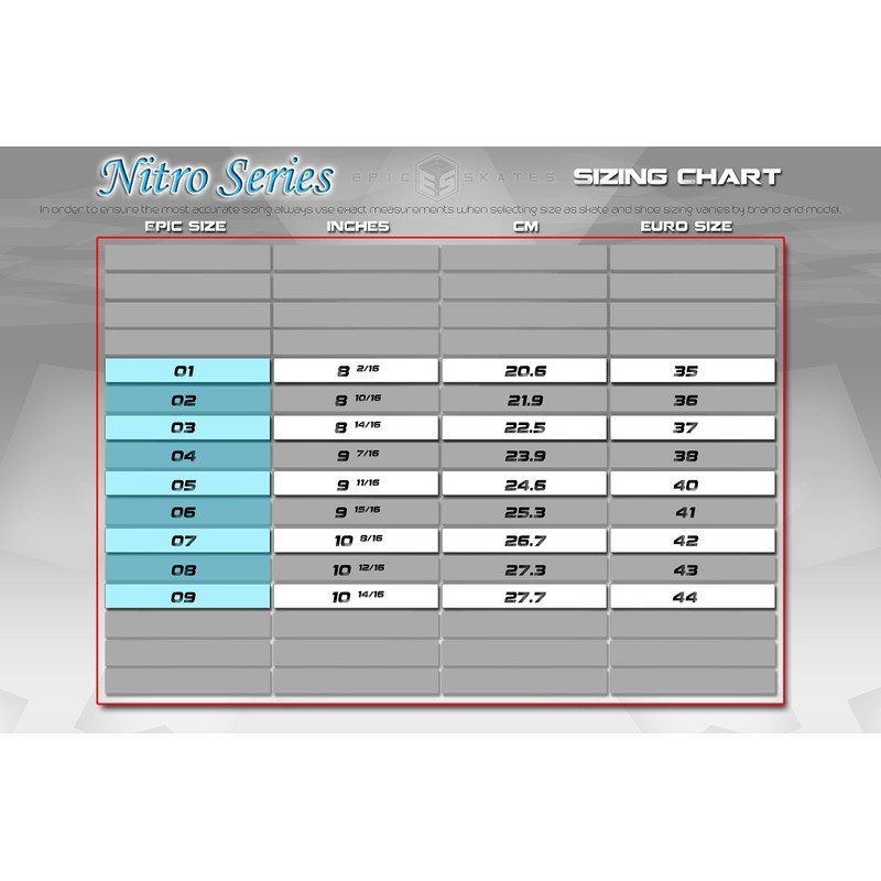 Epic super Nitro Quad speed skates are a fantastic choice whether you are just starting out or you're an intermediate skater. The super Nitro combines quality and reliability all in one package! the new super Nitro line of Quad speed skates features a classic speed skate design with an adjustable speed strap and padded collar creating the perfect combination of comfort and support. The super Nitro's come standard with our indoor/outdoor polyurethane wheels making it easy to transition from skating at the local rink to hitting the sidewalk for a outdoor skate. All Epic Skates now come with two pair of Laces.