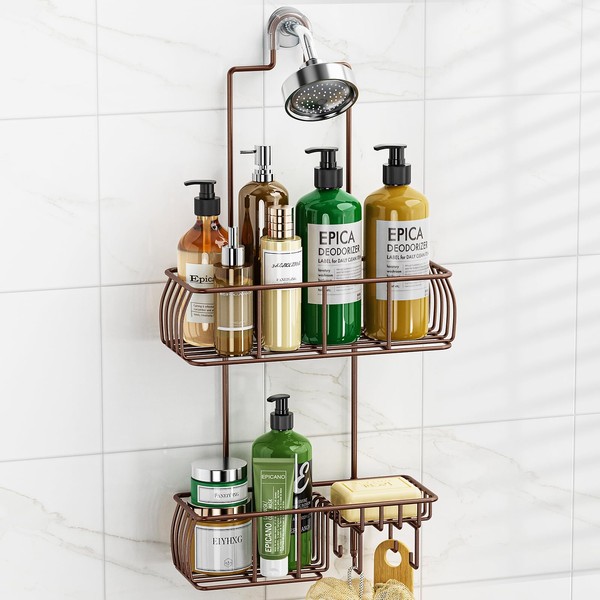 Epicano Shower Caddy Hanging, Anti-Swing Over Head Shower Caddy Rustproof with hooks for Towels, Sponge and more, Bronze