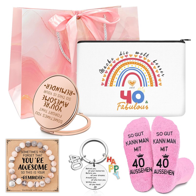 - 🎁【Personalisiertes Geschenk für die 40-jährige Geburtstagsfrau】 Enthält 1 exquisite Geschenktüte, 1 exquisites Armband, 1 Kosmetiktasche, 1 Paar Plüschsocken, 1 roségoldenen Schminkspiegel und 1 Schlüsselanhänger. Jedes Teil dieses Geburtstagsgeschenks ist genau das Richtige und trifft genau ihr Herz.
