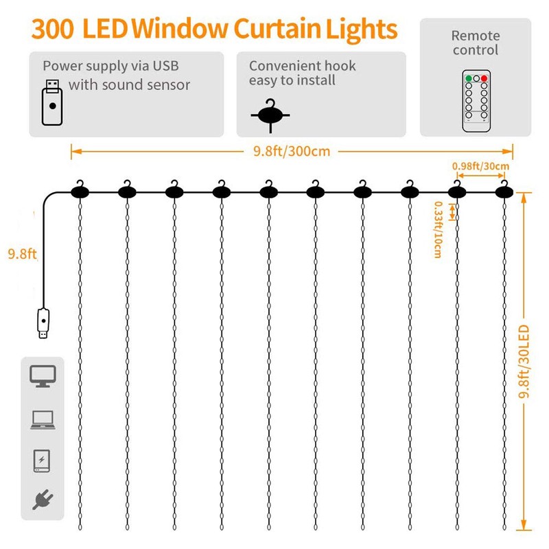 **Description:** 8 Dynamic Light Modes - Combination, In waves, Sequential, Slow glow, Chasing/Flash, Slow fade, Twinkle/Flash, Steady on. 4 Music Control Modes - The string light beating around with the music when you press the button of the Music Control Modes. **Specifications:** Power: 5W LED Quantity: 300 Input Voltage: 5V DC Size:9.8ft x 9.8ft Color: Warm White Material: Plastic+Copper Water Resistance Level: IP44 **Notes:** There is a set of curtain lights with hooks inside the package.Please check if all intact before installation. Please put the light up first, then untie the string bundle to avoid tangle, Please do not cut the string lights. If the string lights are knotted, please untie the lights carefully and do not pull them with force to avoid damaging the product. The product is USB powered,applicable to any charger or power strip with USB Port. If the product fails to work,please check first whether the USB port is properly connected to the power supply portal or not. **Package Include:** 1 x 300 LED Curtain String Light 1x Remote Control
