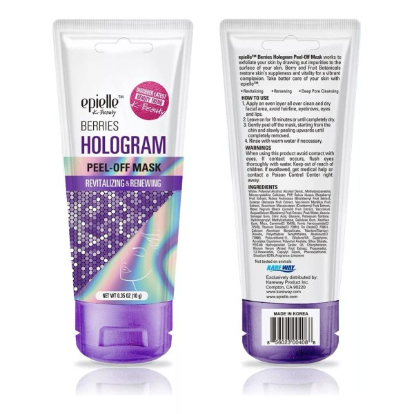 Epielle Hologram Peel-Off Mask works to exfoliate your skin by drawing out impurities to the surface of your skin.; Peel-Off Mask unclog pores while their calming properties help soothe and renew the skin for a youthful complexion; Peel-Off Mask correcting dark spots for a luminous complexion; Peel-Off Mask works to regenerate and rehydrate the skin for a lustrous complexion; Please note that these are 4 single use packs, not 4 tubes Todos nuestros productos estan en inglés SKU 91221051305