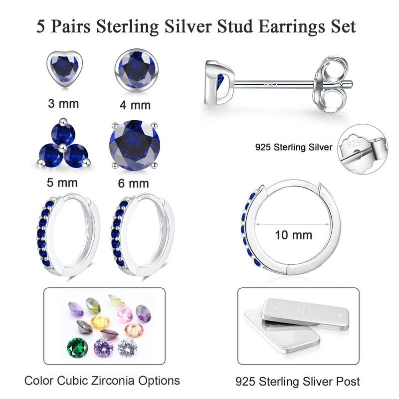 EPIRORA 925 Sterling Silver Stud Earrings Set for Women Men, Hypoallergenic Sapphire Cubic Zirconia Stud Cartilage Helix Earrings, 5 Pairs Silver Hoop Earring Studs Sets for Multiple Piercing